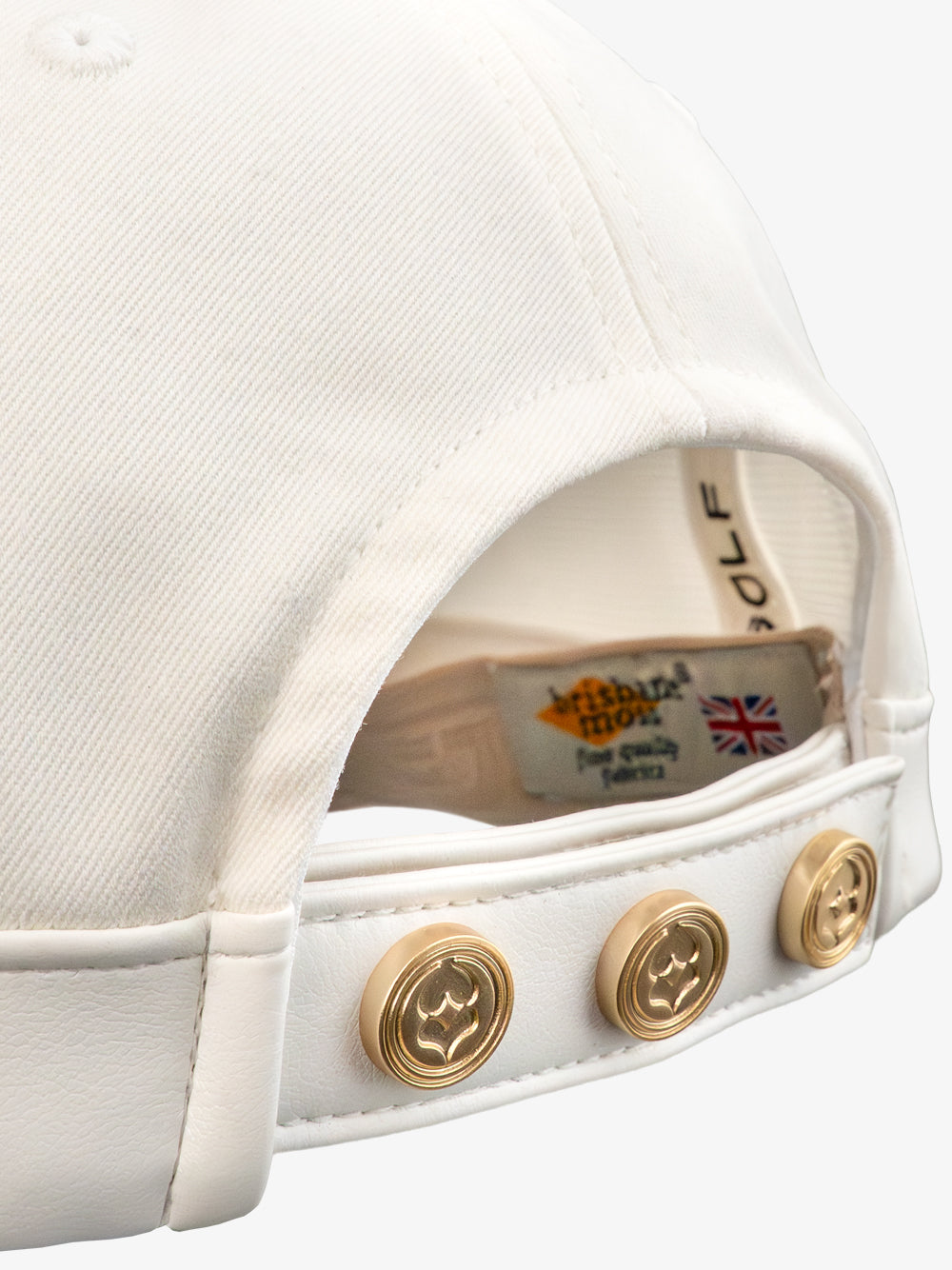 A refined cap blending premium British cotton and leather, accented with an embossed patch and gold snap detail for a classic finish.
